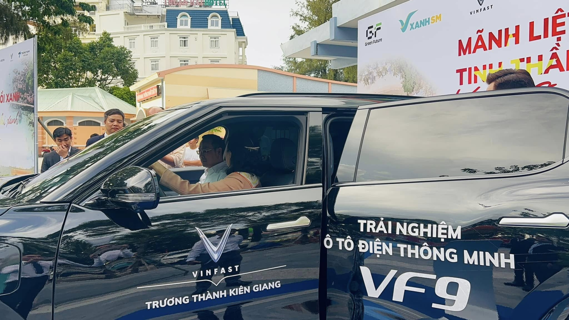 Bà Lê Thị Thu Thủy - phó chủ tịch Tập đoàn Vingroup - Ông Nguyễn Thanh Nhàn - chủ tịch UBND tỉnh Kiên Giang trải nghiệm xe điện VinFast VF9